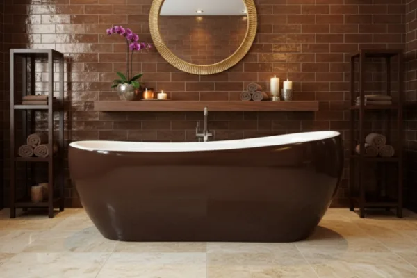 Elegancka, smukła wanna wolnostojąca w odcieniu czekoladowego brązu na zewnątrz